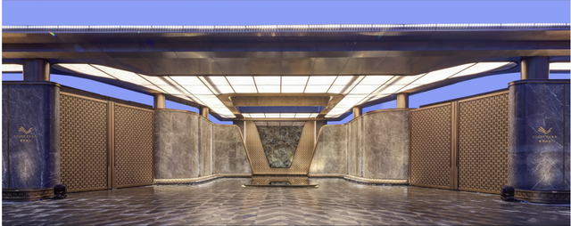 约百米的先锋门庭,延展的尺度、极具序列感与艺术性的设计语言,构成了归家的第一重盛大仪式,在夜色与灯光的映衬下,显露出沉稳而磅礴的气场。范思哲黑奢石水景静静倒映着光影,像一条深邃的星河,引领你向内探寻。