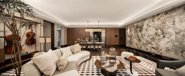 室内空间,是品质最直接的表达。从入户的奢石与金属格栅,到客厅整面铺陈的雪山蓝岩板背景墙,再到 1.8米×0.9米大规格地砖的密拼铺设,细节之处皆是对奢华氛围的精准把控。从一线品牌的厨电卫浴,到四玻两腔的系统窗、全屋的中央空调与新风,这些“内在美”的细节,共同守护着未来居住的健康与舒适度。